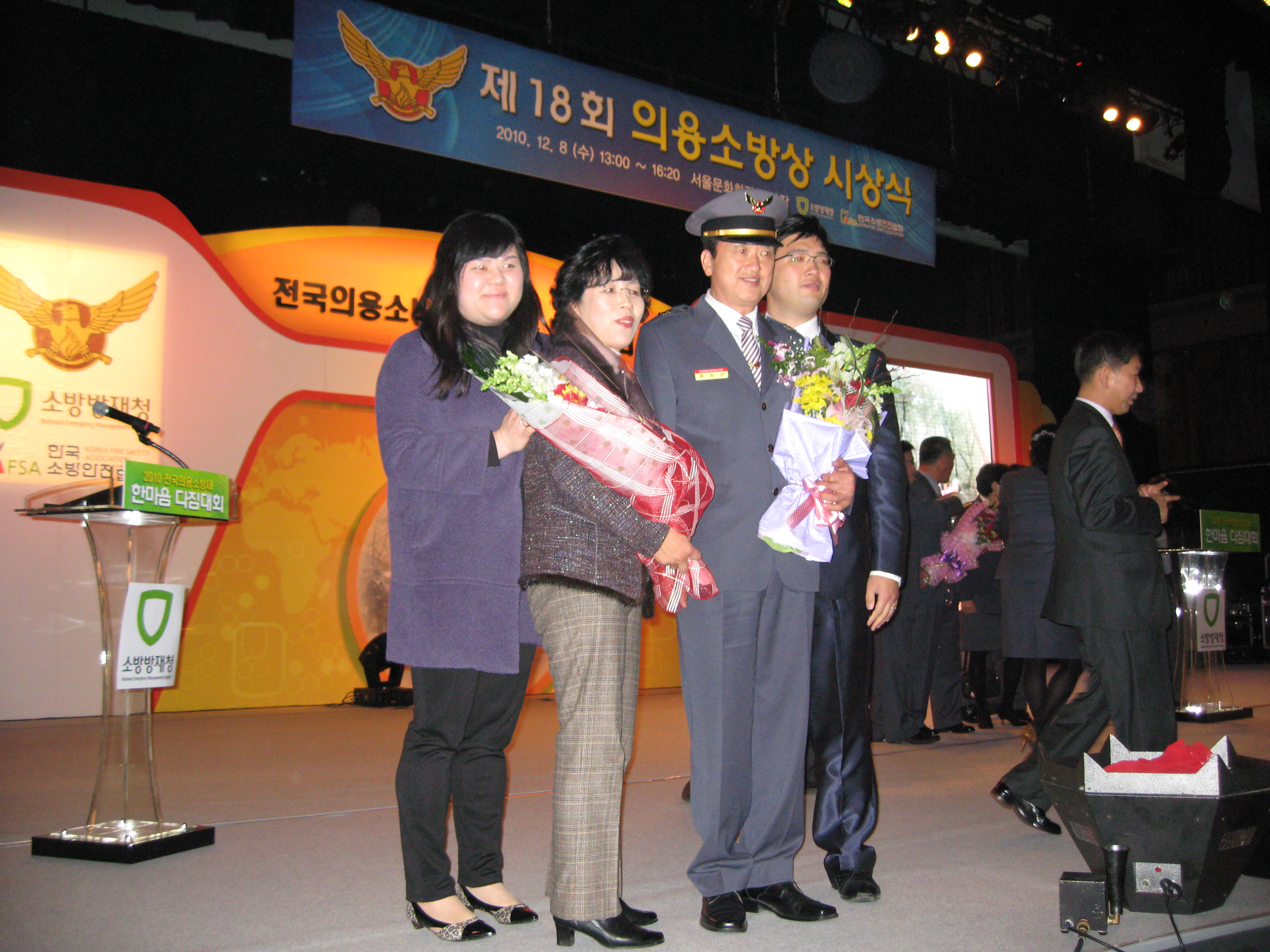 춘천소방서 춘천의용소방대 지도부장 최승진(남,58세)씨는 소방방재청에서 주관하는 “2010 전국의용소방대 한마음 다짐대회”에 참가하여 “제18회 의용소방상 본상(행정안전부장관)”을 수상했습니다. 의용소방대의 사기진작과 봉사의식 함양을 위한 한마음 다짐대회는 12월 8일 서물교육문화회관 대극장에서 개최되었으며, 최승진씨는 의용소방대의 변화와 발전에 기여하고 헌신?봉사를 실천하는 모범대원으로 선정되어 표창을 수상했습니다.