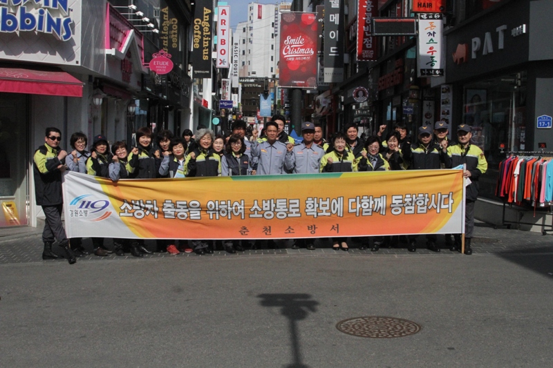 경찰, 시청 안전총괄담당관 등 유관기관이 참여한 이번 소방차 길 터주기 훈련은 상습정체구간인 춘천 중앙로 일대에서 실시하였으며, 훈련종료 후 춘천남성의용소방대, 춘천여성전문의용소방대원들과 함께 춘천 중앙시장 및 명동일대에서 홍보전단지 배부, 현수막 홍보 등 캠페인을 실시하였다.