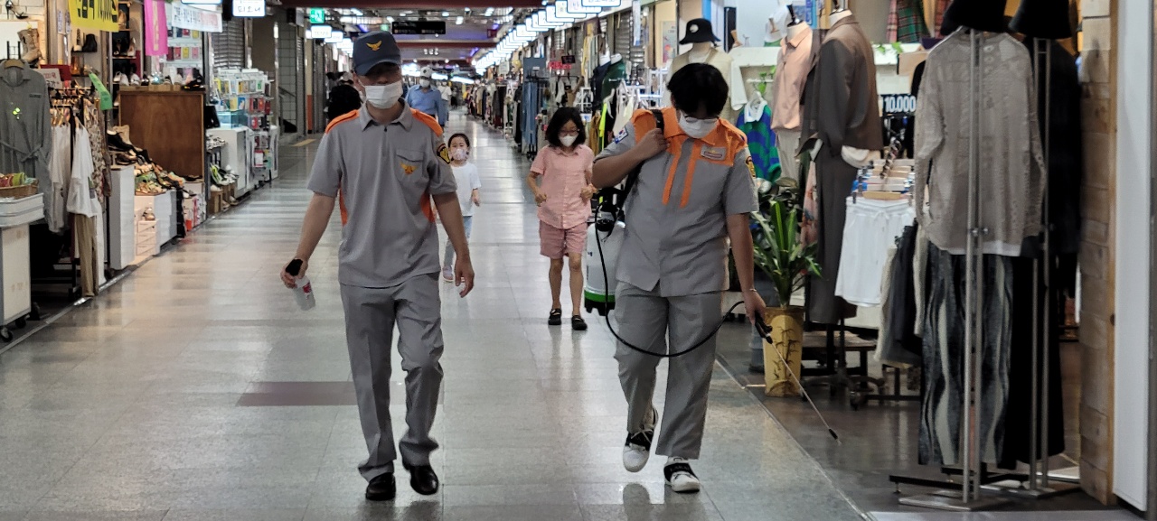 춘천남성의용대는 매달 전통시장을 방문하여 코로나19 예방 방역활동을 전개하고 있다.