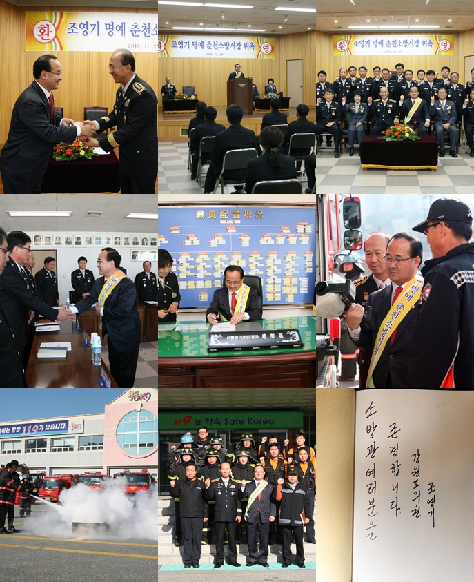 춘천소방서(서장 조완구)는 불조심 강조의달을 맞아 변화된 춘천소방의 모습과 업무를 소개하고 귀중한 고견을 들어, 향후 소방행정 발전방향에 반영함으로서 향상된 서비스로 시민과 함께하는 계기를 마련하고자 11.29(월) 오전 10:30, 본서 대회의실과 청사에서 <조영기 명예 춘천소방서장 위촉행사.를 가졌습니다.