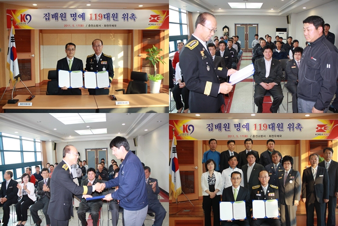 춘천소방서(서장 조완구)는 17일 오후6시에 화천우체국(국장 정호백) 회의실에서 집배원 21명을 명예 119대원으로 위촉과 유관기관 업무협약을 체결하고 화재예방교육도 병행 실시했습니다.