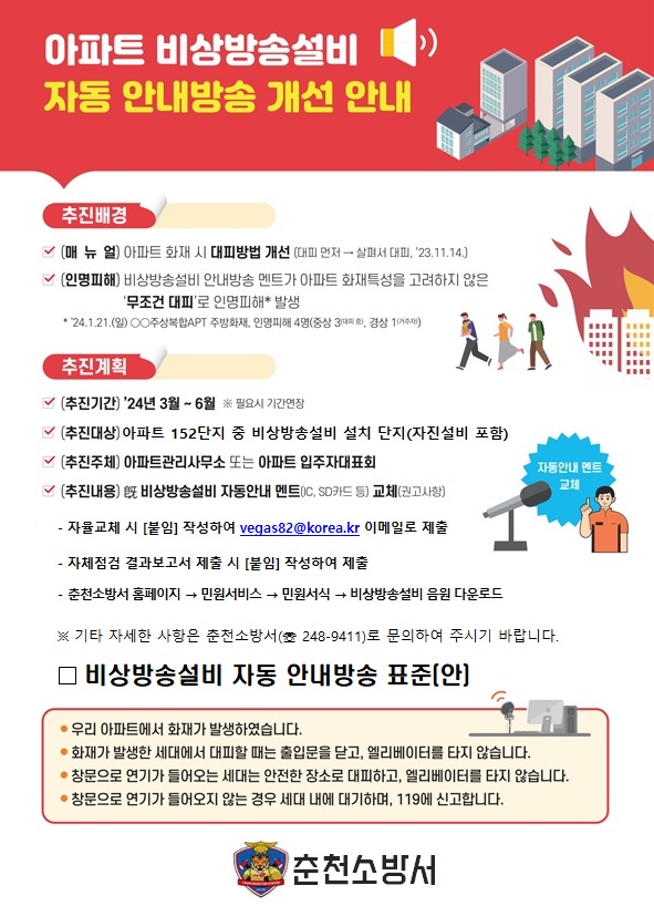 관련 소방관련업체에서는 아파트 비상방송 안내멘트가 교체 될수 있도록 협조하여 주시기 바랍니다.
