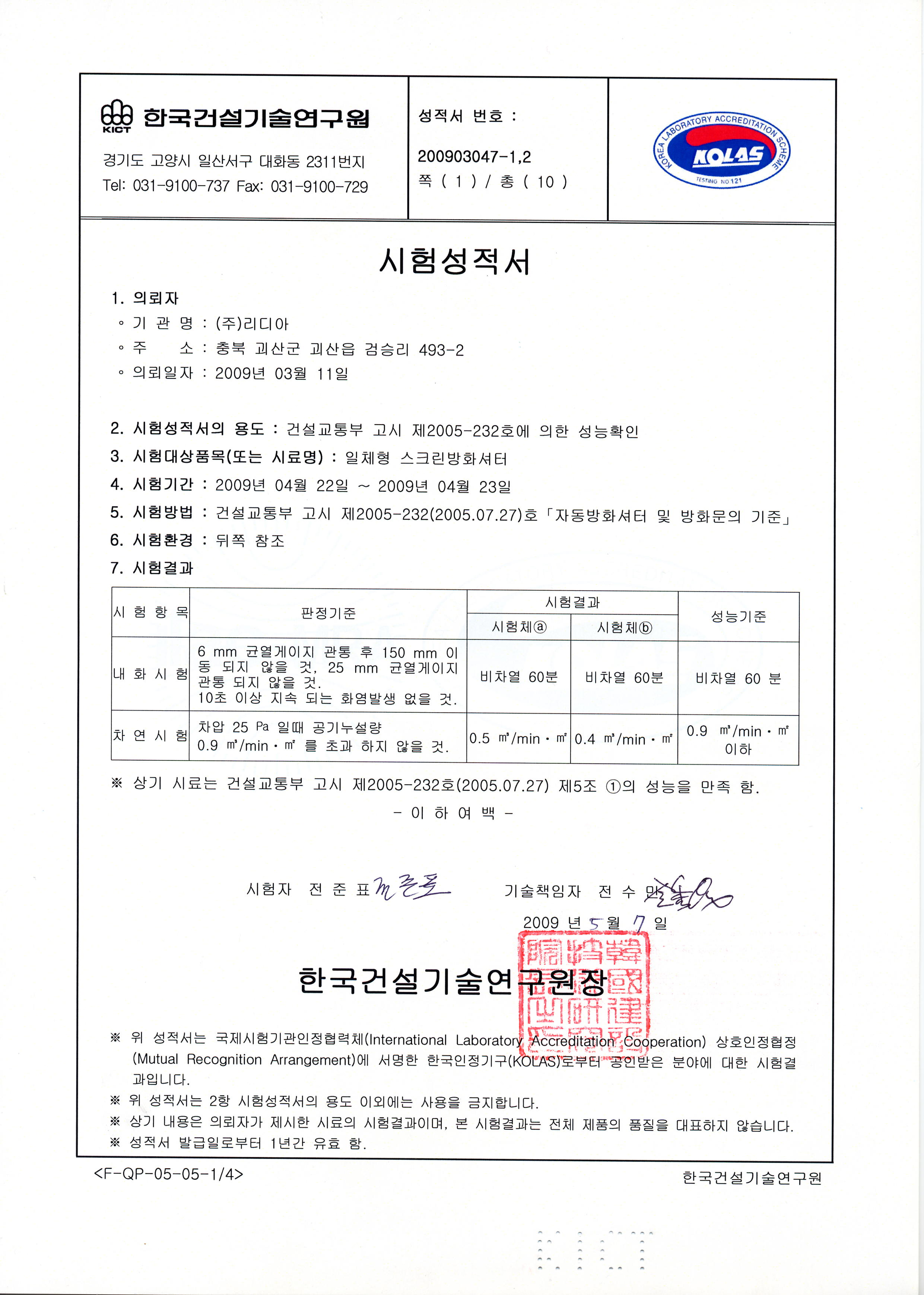 1. 설치 코자하는 스크린 방화셔터는 건설부고시 2005-232호 제5조 의 성능을 만족 합니다.(2009년5월7일 성능 시험 완료)