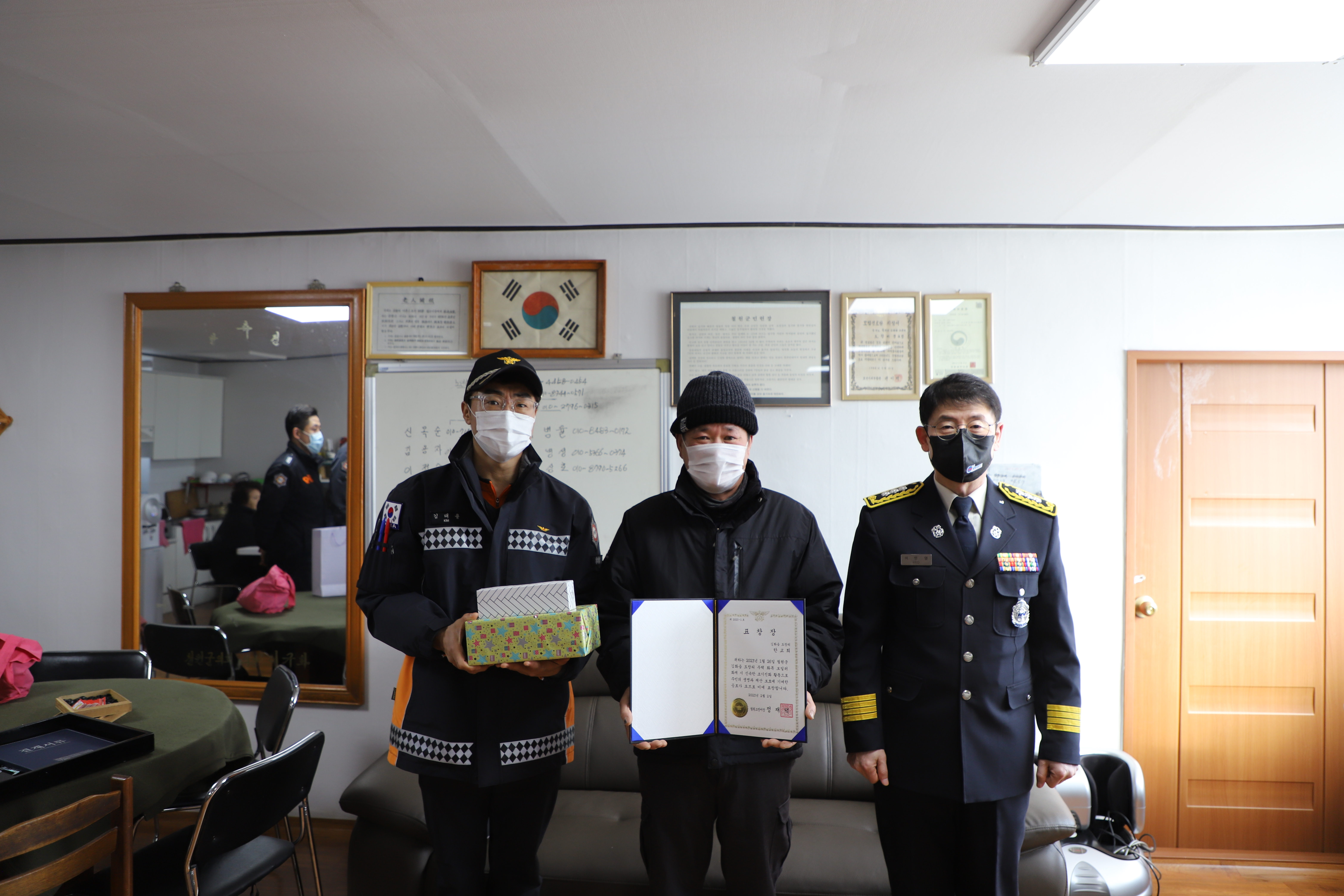 철원소방서는 공로를 인정하고, 감사한 마음을 담아 한교희씨에게 표창을 수여하고 기념품을 전달하는 등 표창 수여식을 진행했다.