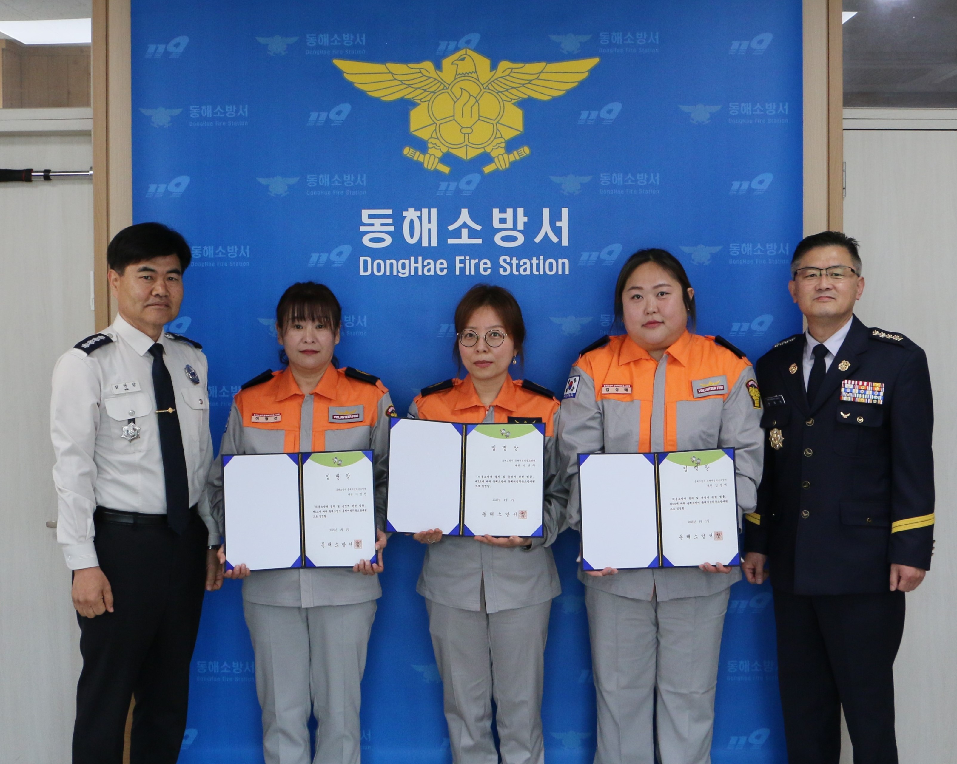 이 날 임명장 수여식은 심규삼 서장과 동해소방서 북평의용소방대장, 각 과장 등이 참석한 가운데 신규 의용소방대원 3명에게 임명장을 수여하고 기념촬영 순으로 진행됐다. 이번에 새로 임명된 이영선, 백연주, 김성매 대원은 의용소방대원으로서 주민들에게 봉사할 기회를 갖게되어 기쁘다며 앞으로의 활동을 기대하라는 포부를 밝혔다.