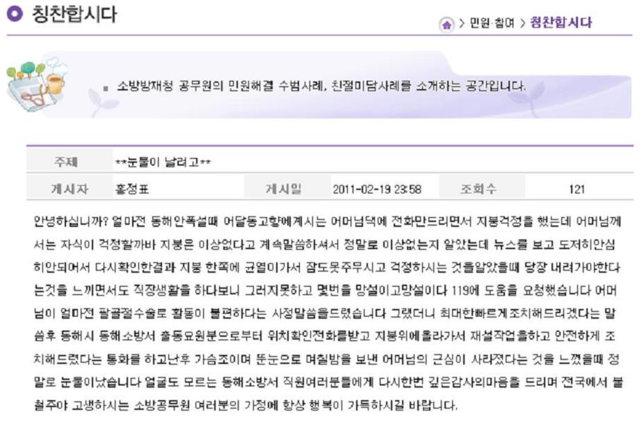 소방방재청 칭찬합시다 펌글입니다.