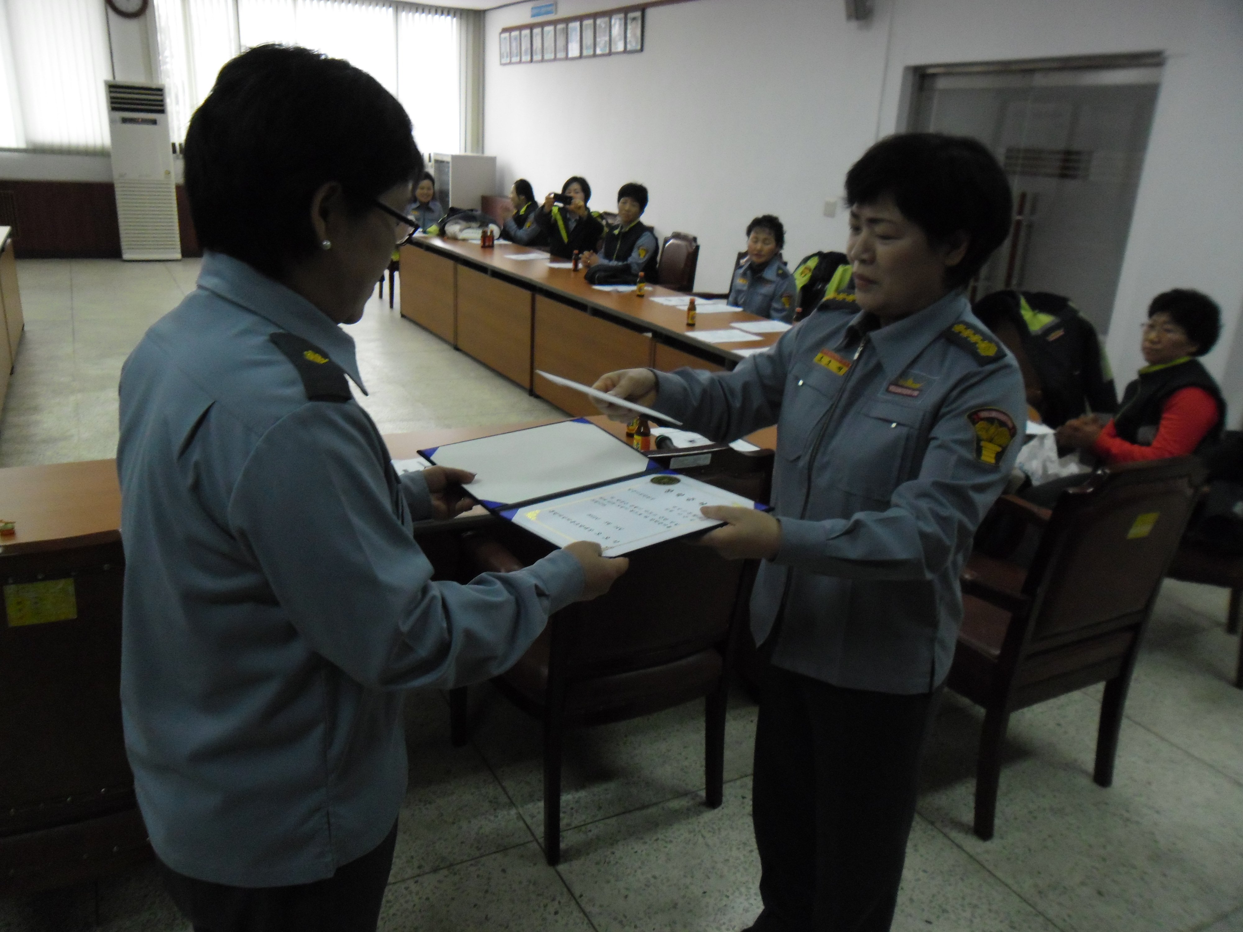 자체교육 시간에는 고3 자녀를 둔 대원(피미숙반장외 2명)들에게 장학금을 지급하는 시간과 일정시간동안 꾸준히 봉사를 해 온 대원(안성희구호부장외 5명)들에게 자원봉사센터에서 발급 받은 자원봉사자 마일리지증을 전달했답니다.