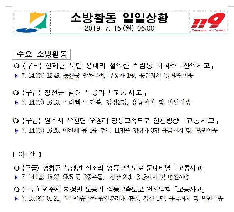 소방활동 일일상황(7. 15. 월) 06:00