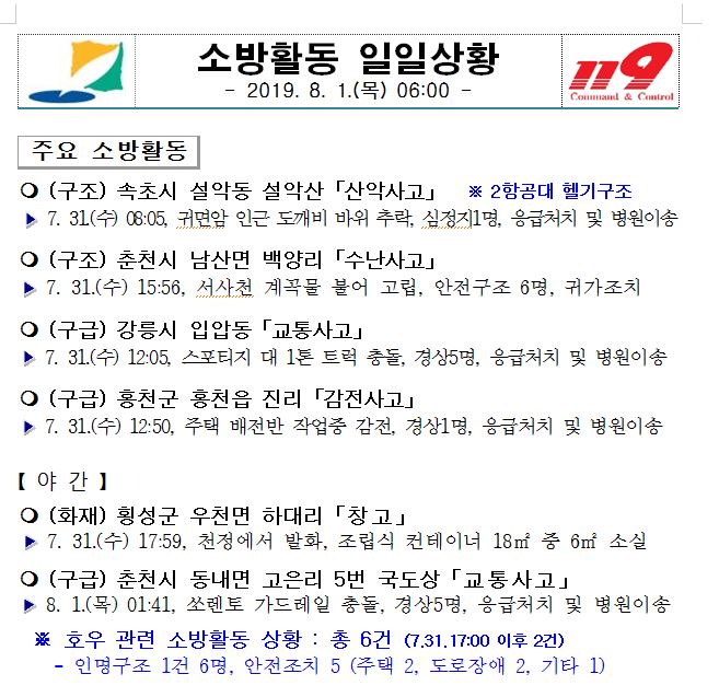 소방활동 일일상황(8. 1. 목) 06:00