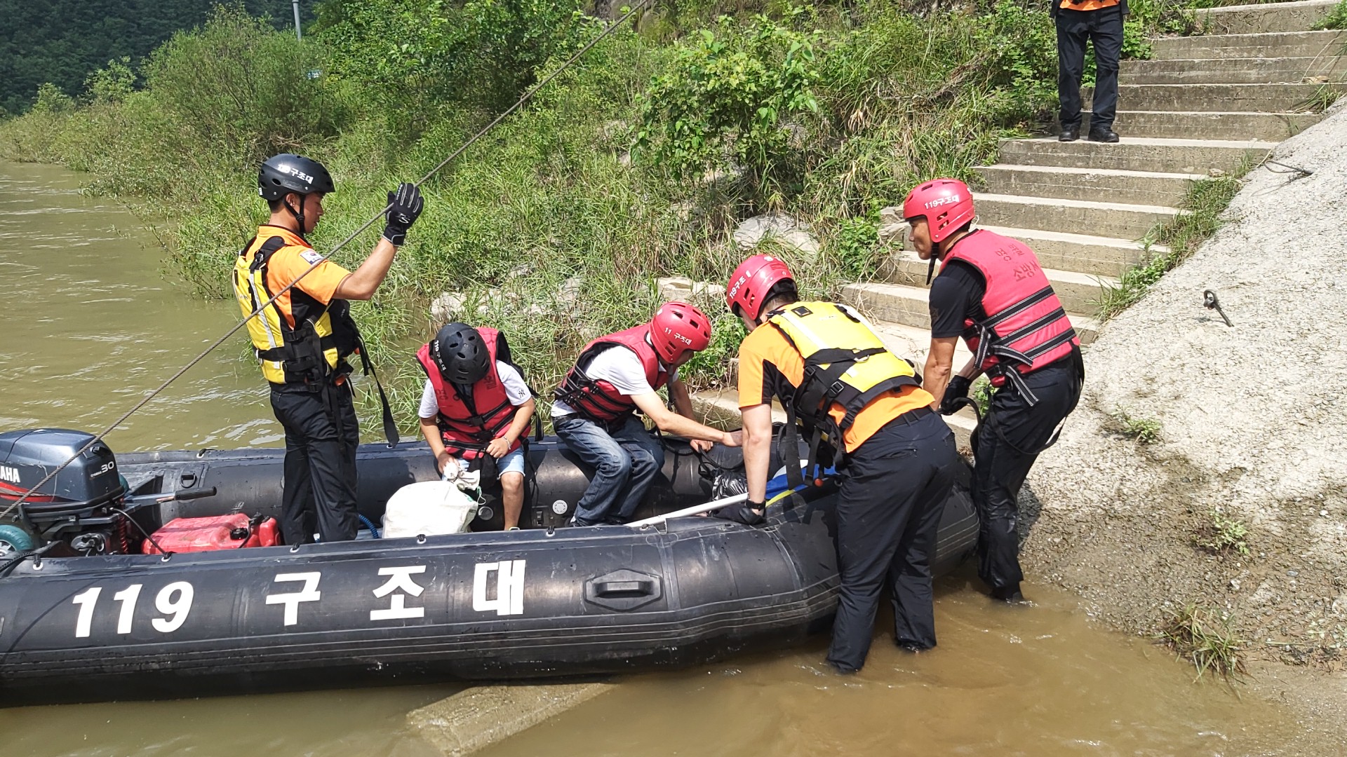 - 내용 : 인천에서 상기 가정마을 할머니집을 방문한 11세 손자가 복통으로 병원 진료를 받아야하나, 전날 내린 폭우로 불어난 동강을 건너지 못하여, 영월소방서 구조대 보트를 이용 도강 구조 후 병원진료한 상황.