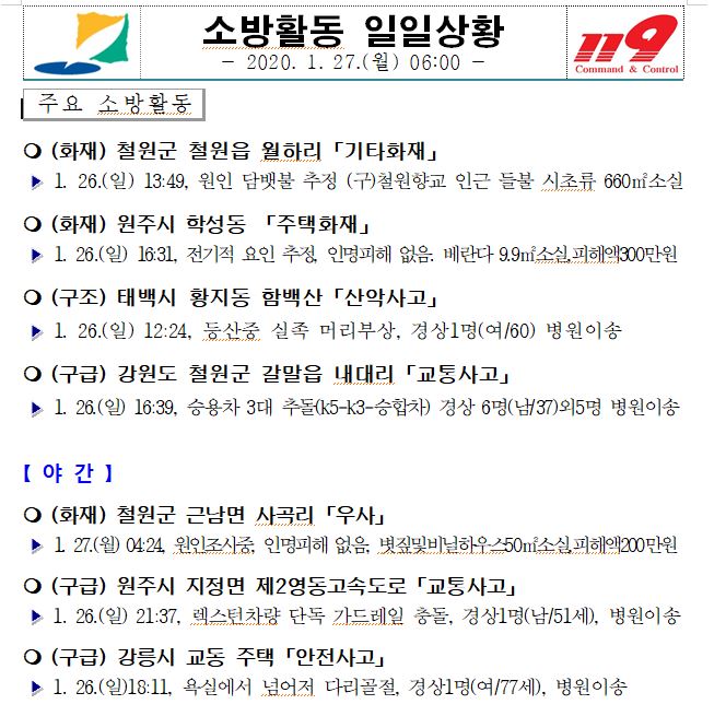 소방활동 일일상황 (1. 27. 월) 06:00