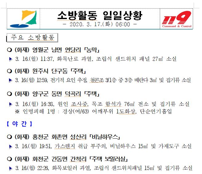 소방활동 일일상황 (3. 17. 화) 06:00