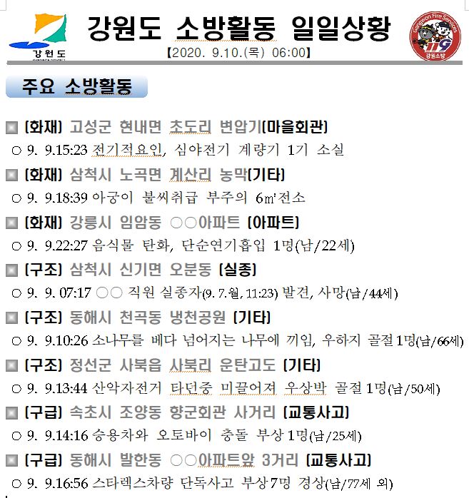 소방활동 일일상황(9. 10. 목) 06:00