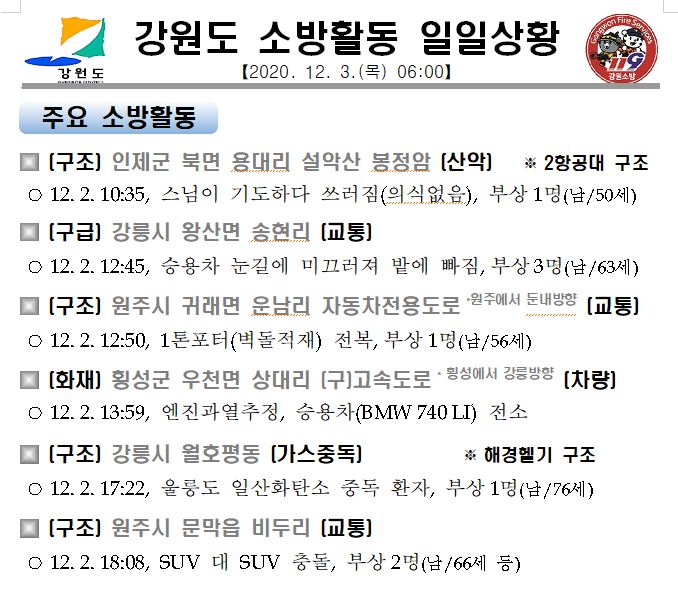강원도 소방활동 일일상황(12. 3. 목) 06:00