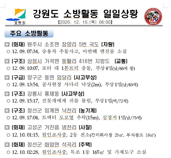 강원도 소방활동 일일상황(12.10.목) 06:00