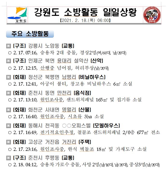 강원도 소방활동 일일상황(2. 18. 목) 06:00