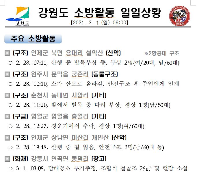 강원도 소방활동 일일상황 (3. 1. 월) 06:00