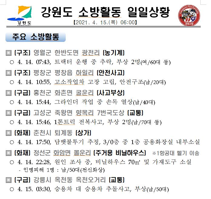 강원도 소방활동 일일상황 (4. 15. 목) 06:00