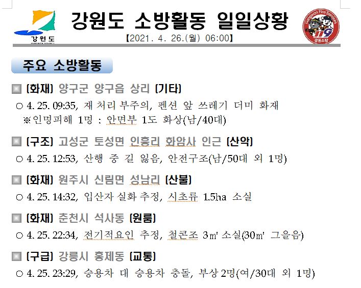 강원도 소방활동 일일상황(4. 26. 월) 06:00