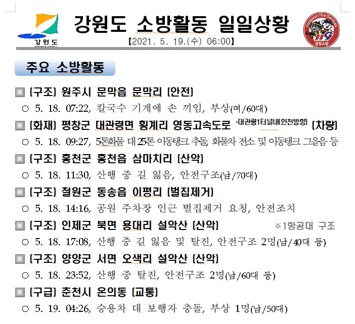 강원도 소방활동 일일상황(5. 19. 수) 06:00
