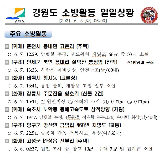 강원도 소방활동 일일상황 (6. 8. 화) 06:00