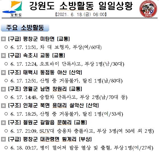 강원도 소방활동 일일상황 (6. 18. 금) 06:00