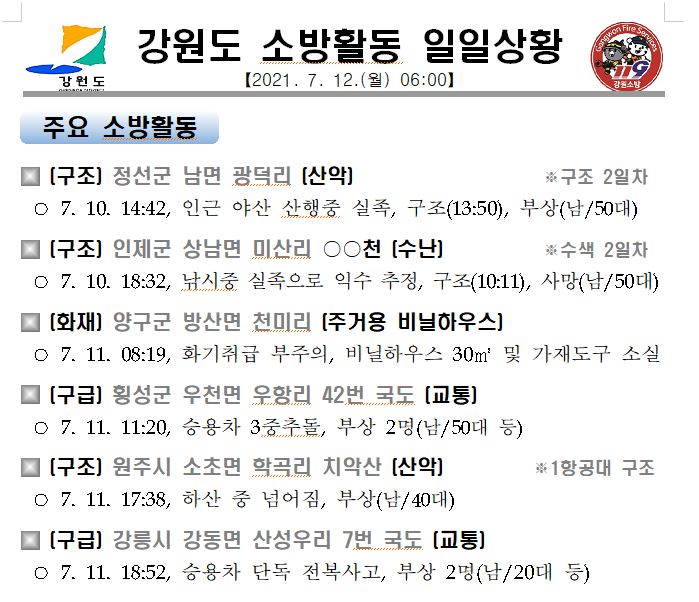 강원도 소방활동 일일상황 (7. 12. 월) 06:00