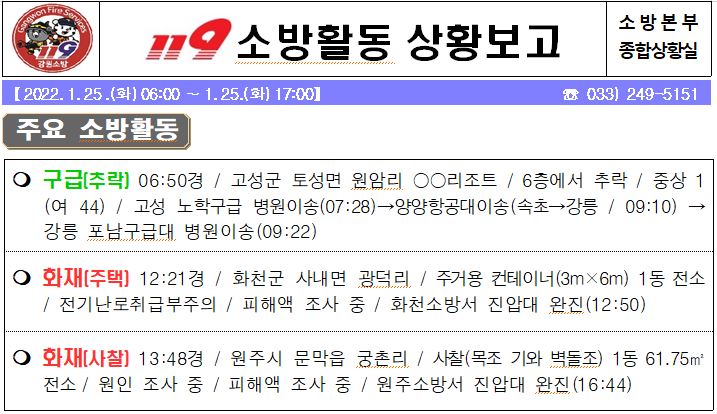119 소방활동 상황 보고(1. 25. 화) 17:00