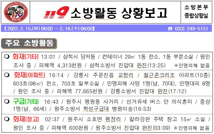 119 소방활동 상황보고(2. 16. 수) 06:00