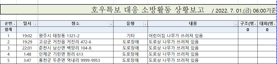 호우관련 소방활동 실적(7.1. 06시 기준)