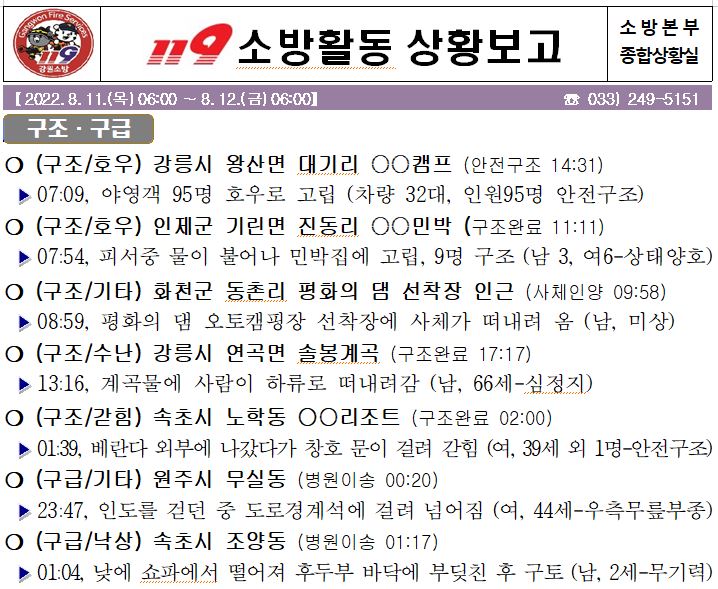 119 소방활동 상황보고(8. 12. 금) 06:00