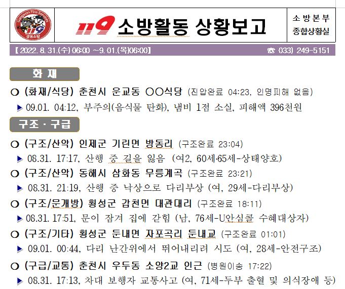 119 소방활동 상황보고(9. 1. 목) 06:00