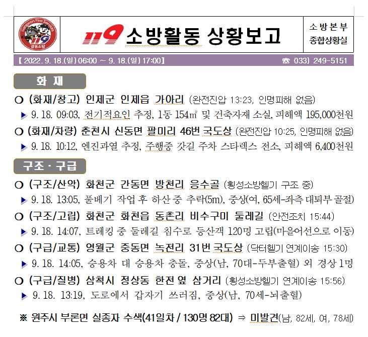 119 소방활동 상황보고(9. 18. 일) 17:00