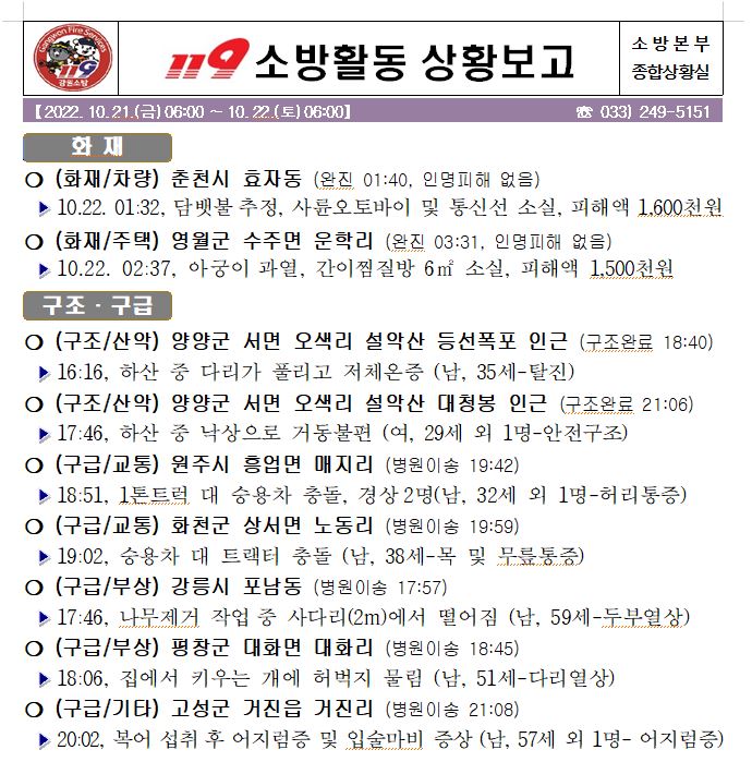 119 소방활동 상황보고(10. 22. 토) 06:00