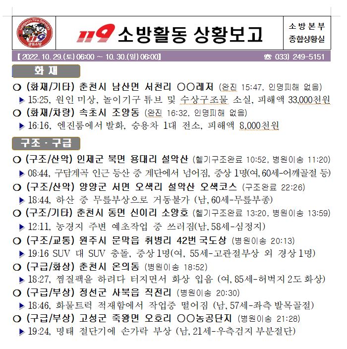 119 소방활동 상황보고(10. 30. 일) 06:00