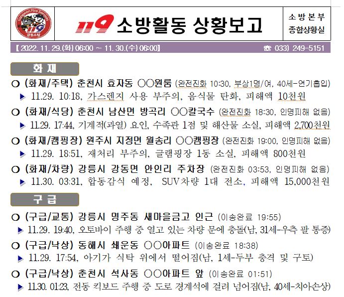 119 소방활동 상황보고(11. 30. 수) 06:00