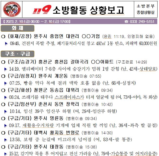 19 소방활동 상황보고(2. 10. 금) 17:00