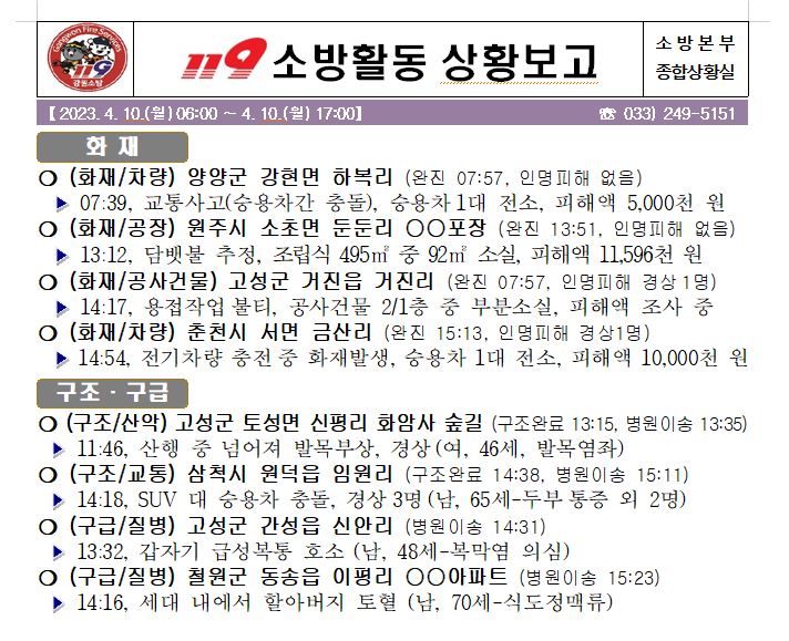 119 소방활동 상황보고(4. 10. 월) 06:00