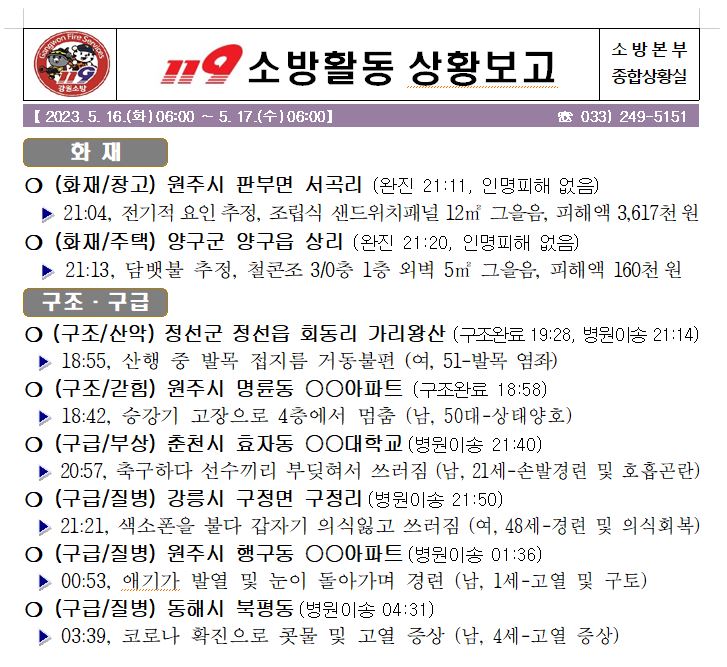 119 소방활동 일일상황보고(5.17.수) 06:00