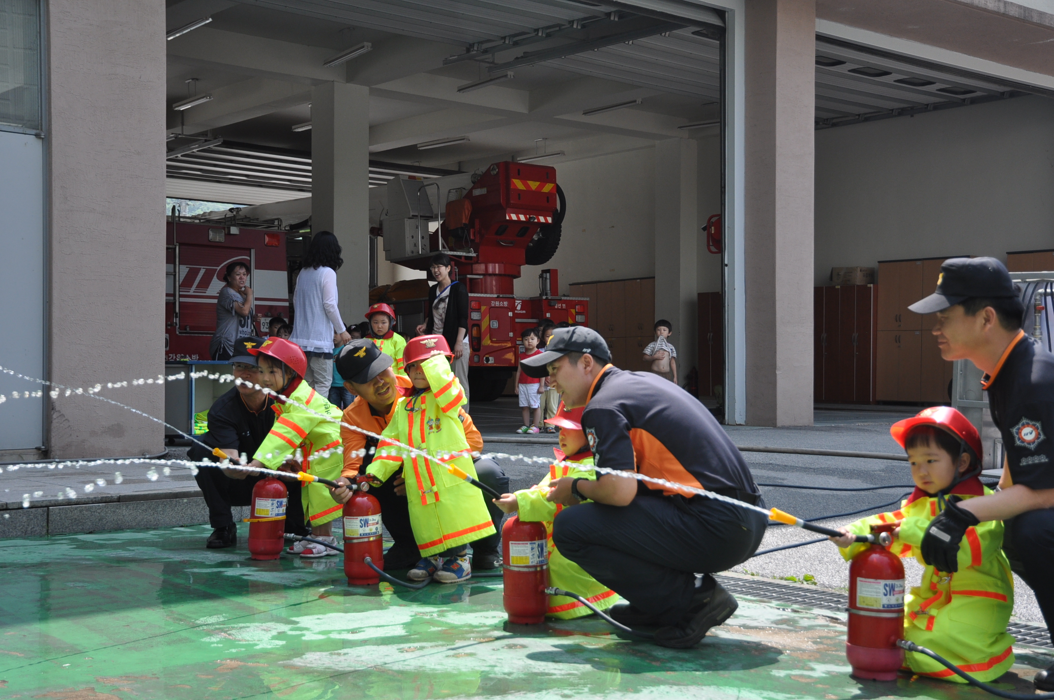 정선소방서(서장 박창진)는 19일 오전 정선읍 소재 봉양어린이집 원아 100여명을 대상으로 물소화기 체험과 구조장비 관람 및 탑승 등 소방안전체험을 실시했다.