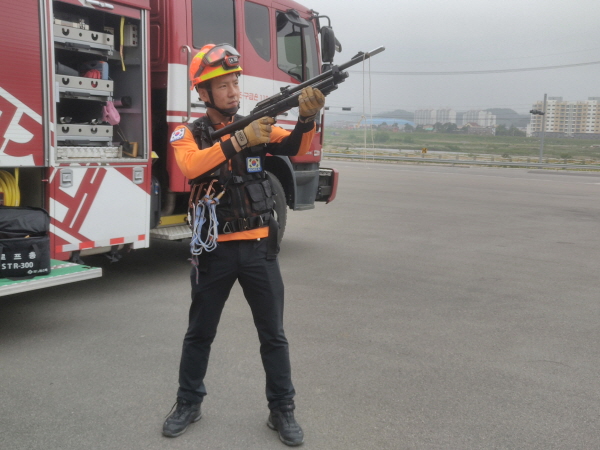 표준기법에 따라 감독관의 지시아래 장비조작 순서와 방법을 익힘으로서 실제현장에서도 능숙하게 장비를 다룰 수 있도록 했으며, 항상 준비된 자세로 언제 어디서 발생할지 모르는 화재 및 구조출동에 대비하여 굴절 사다리차 조작, 에어매트 전개 및 마취총 조작훈련 등을 실시했다.
