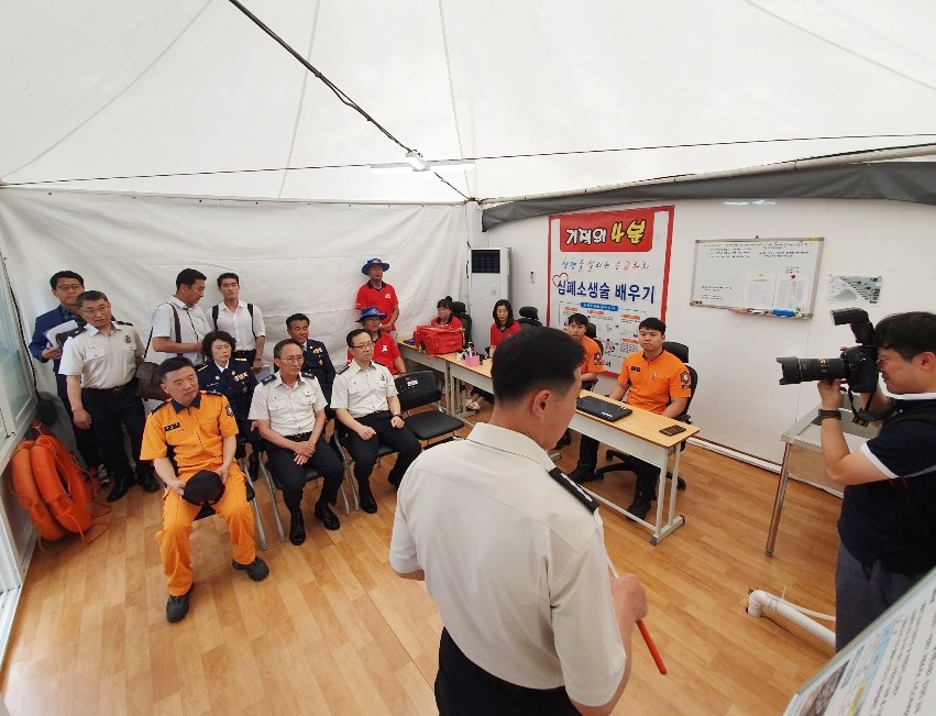 정문호 소방청장은 24일 오전 10시 휴가철대비 대형숙박시설 현장점검과 경포 시민수상구조대, 동해안 산불방지센터를 방문하여 근무자의 노고를 격려했다.