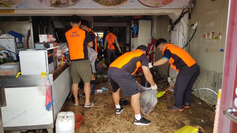 강릉소방서(서장 진형민) 경포수난전문의소대(대장 김용성) 30여명은 지난 3일부터 오늘(4일)까지 제18호 태풍 ‘미탁’으로 침수 피해가 큰 강릉 경포 진안상가에서 수해복구 활동을 펼쳤다고 밝혔다