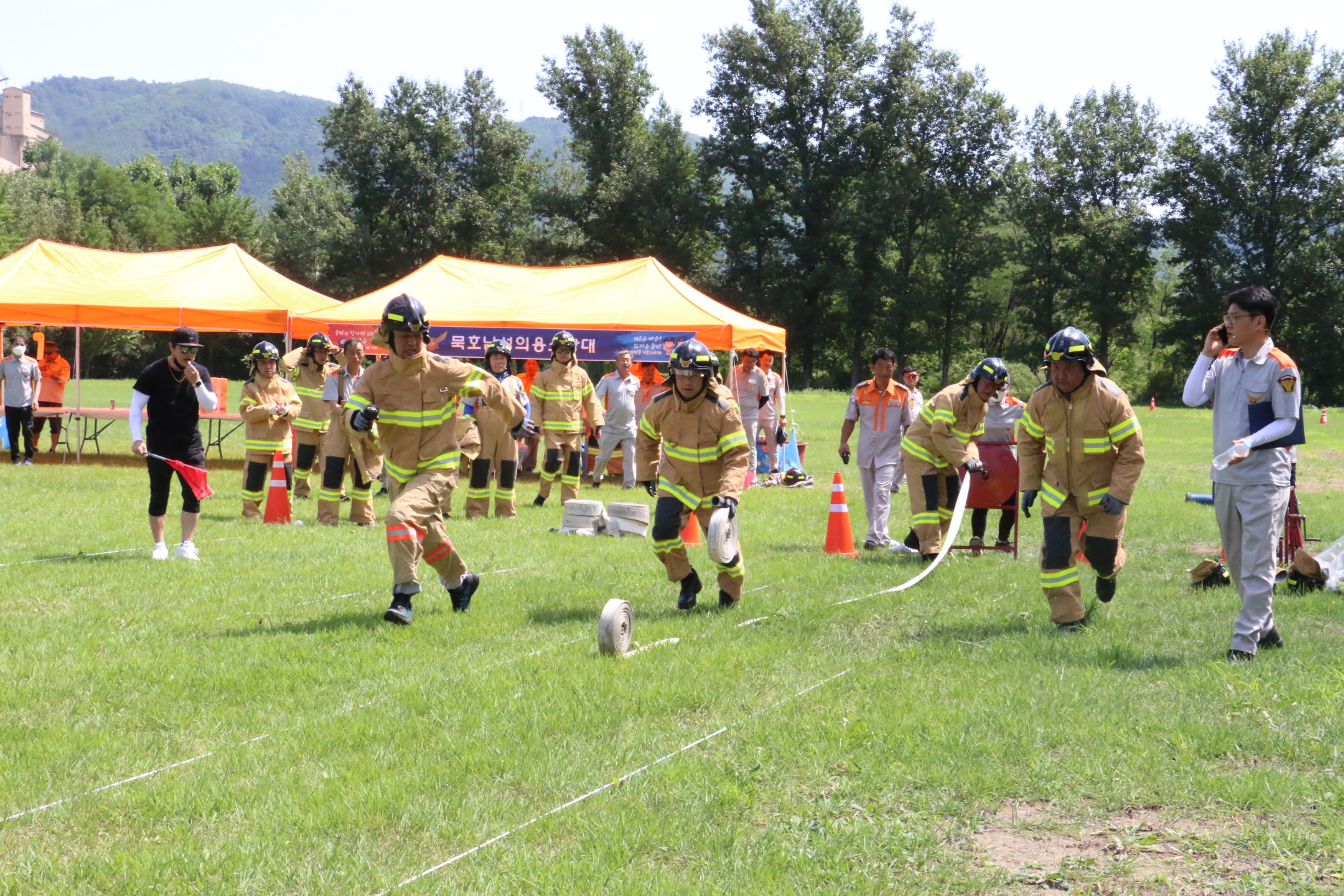 경연대회는 현장대응 능력펑가를 위한 소방호스끌기,수관연장하고 방수자세 및 심폐소생술 등 기술경연 3종목과 수관볼링, 계주, 족구, 노래자랑 등 생활체육 3종목으로 나눠 경연을 펼쳤다