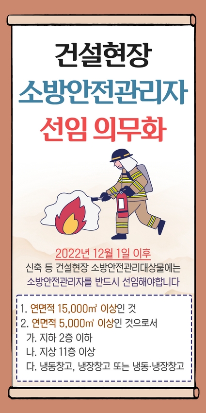 「화재의 예방 및 안전관리에 관한 법률」제29조에 따라 건설현장 소방안전관리자 선임이 의무화(시행 : 2022.12.1.)되었습니다.