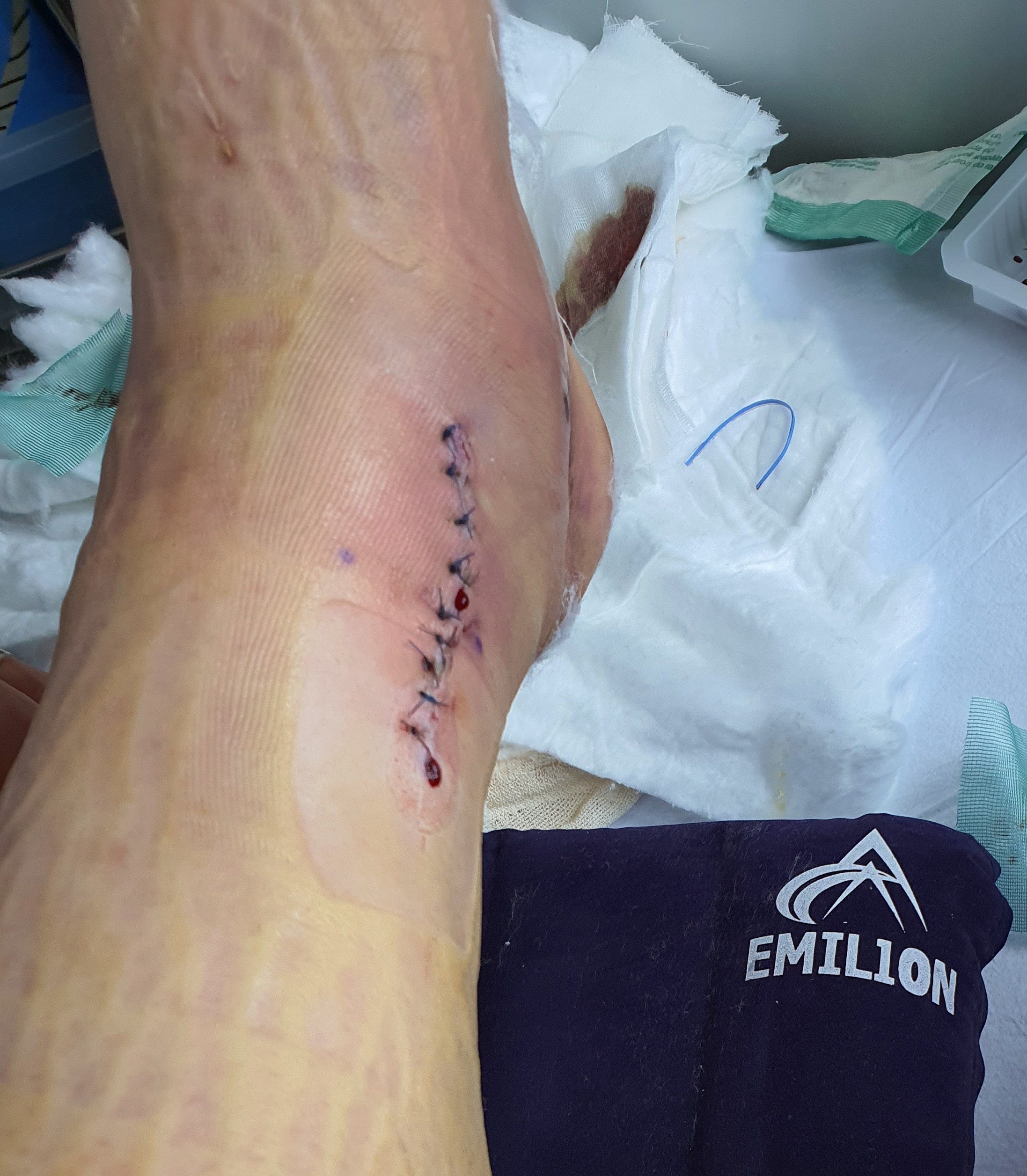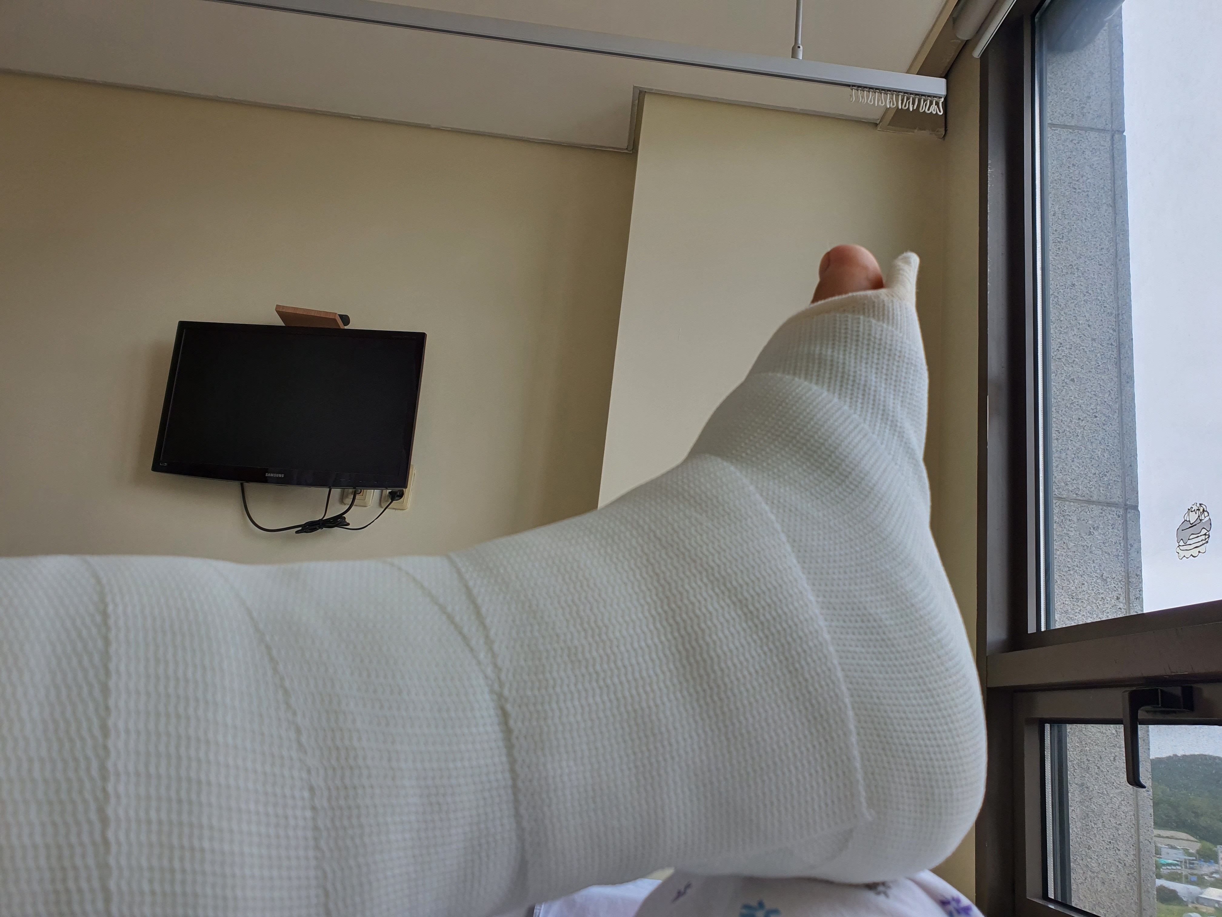 인대가 끊어지고 발목이 부러져서 그날 바로 입원을 했고 수술을 하고 통깁스를 하고