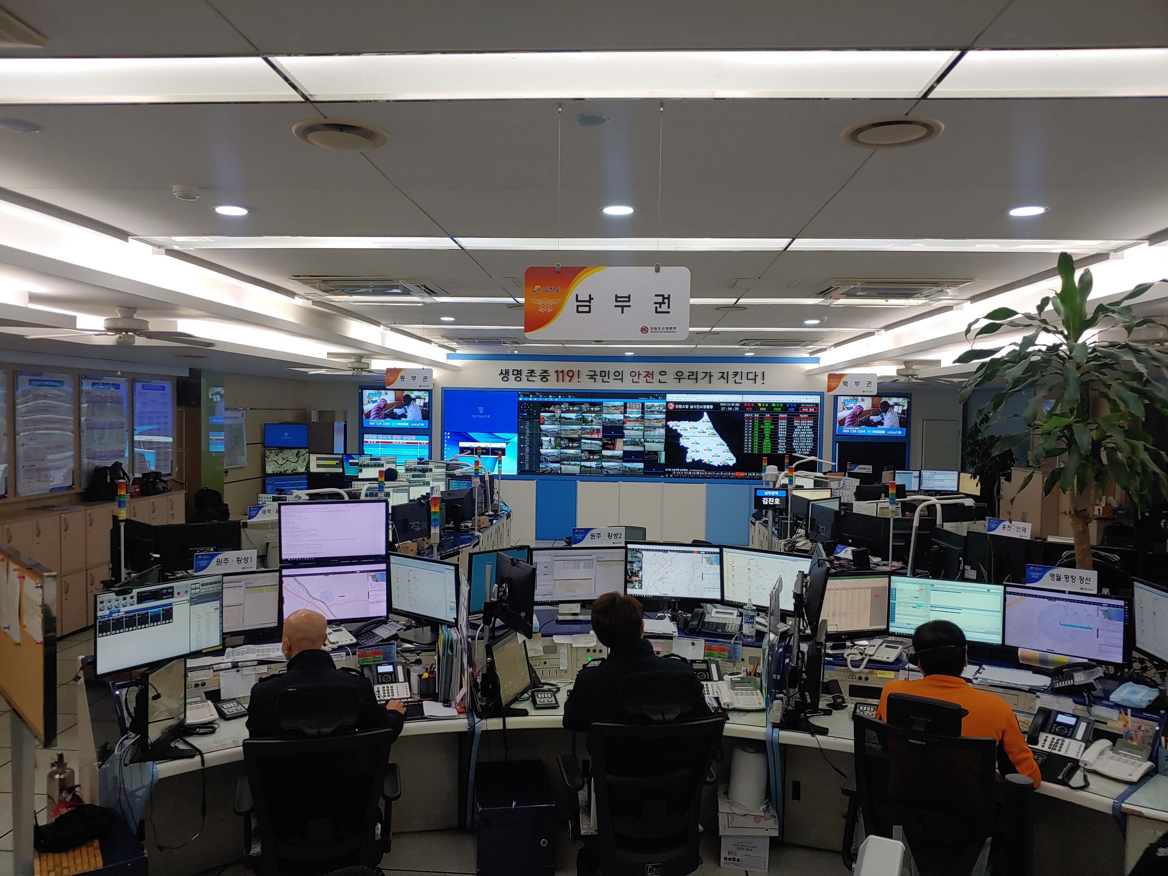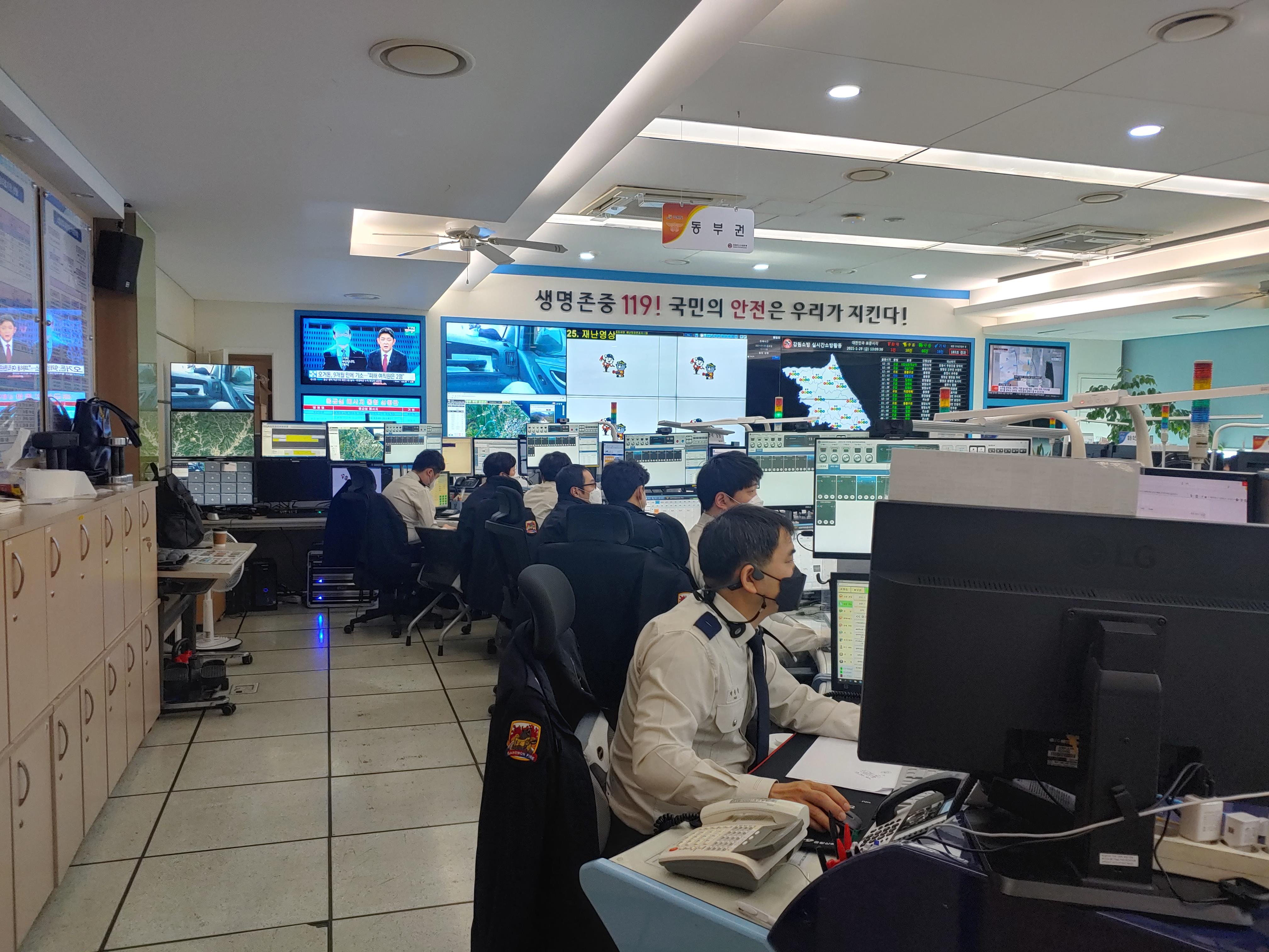 ○ 화재·구조·구급 등 각종 사건·사고 발생시 접보·출동지령 등 재난 컨트롤타워가 바로 강원소방본부‘119종합상황실’이다.