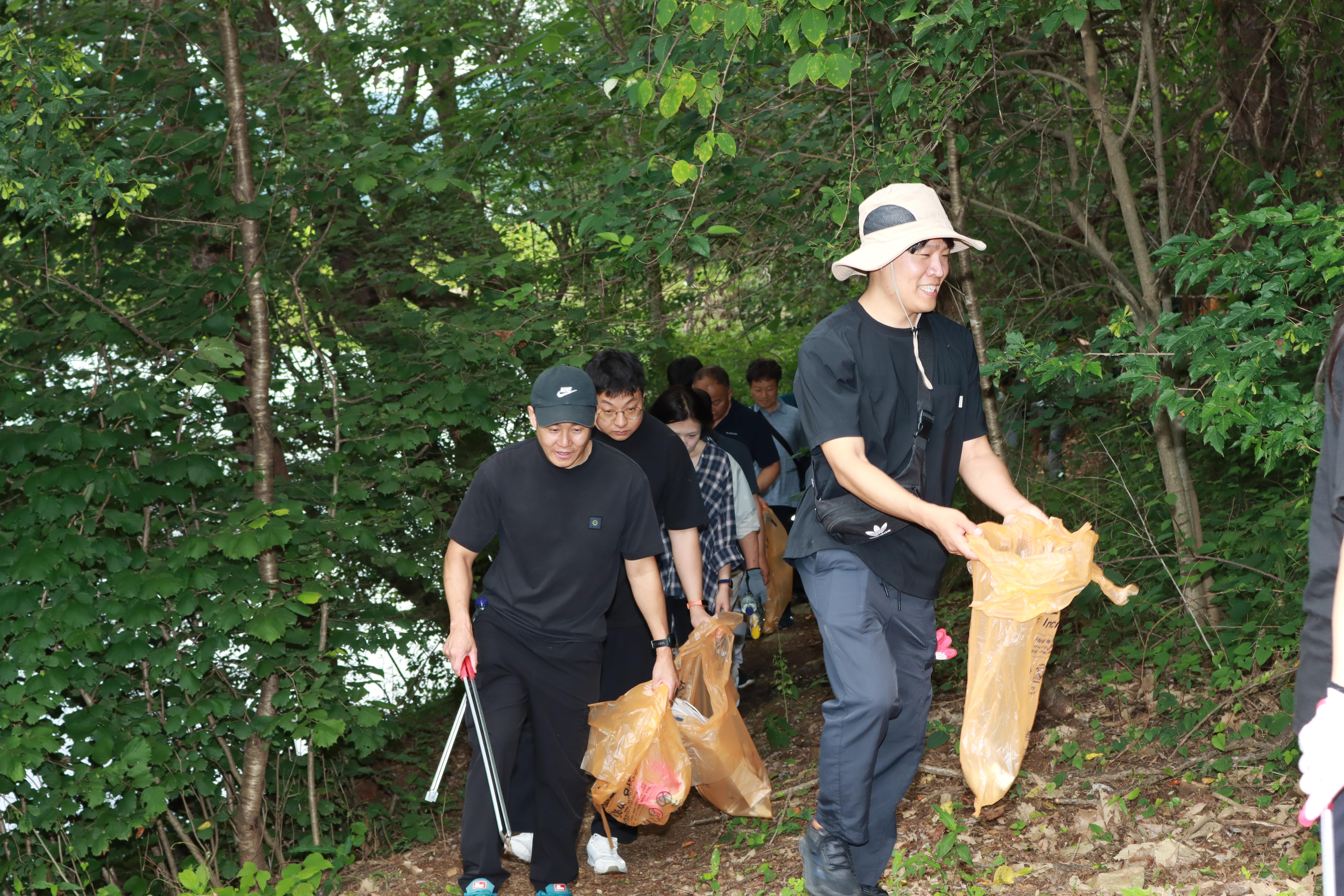 ○ 소방본부 직원들은 금병산 숲길을 따라 일회용품, 플라스틱, 담배꽁초 등 각종