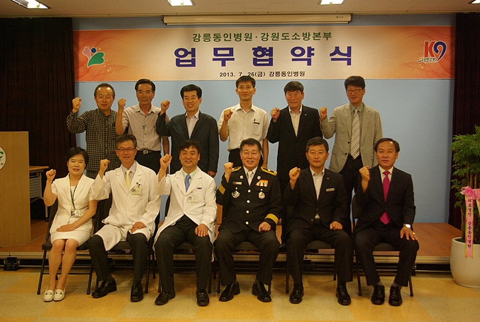 7월 26일 11:30 강릉동인병원 응급센터 지하 강의실에서 오대희 강원소방본부장 , 박창진 강원소방행정과장, 정은철 강릉소방서장 등 소방 및 강릉동인병원 관계자 20여명이 참석한 가운데 강원도소방본부와 강릉동인병원 간 소방전문치료센터 업무협약식을 체결하였습니다.