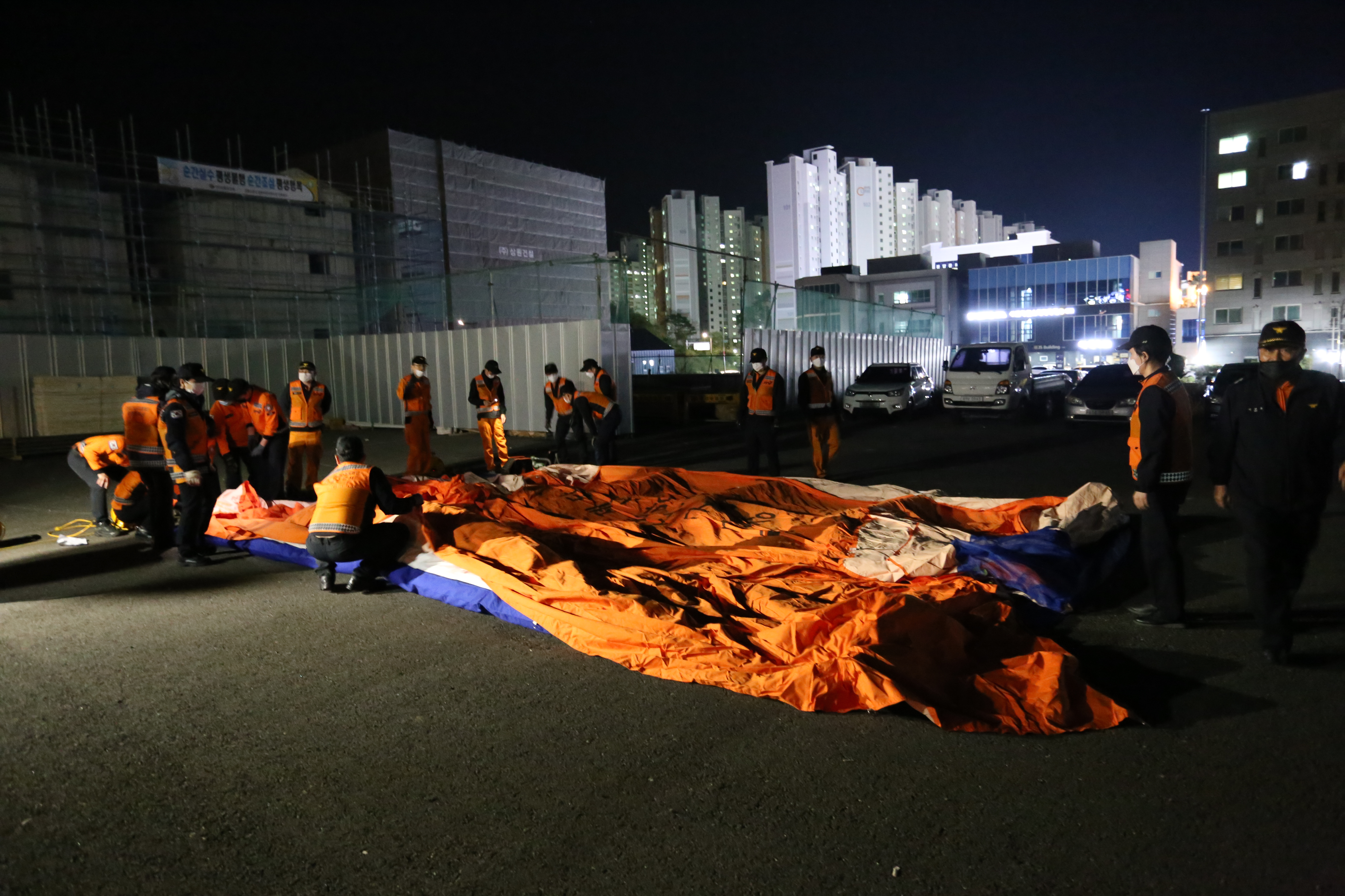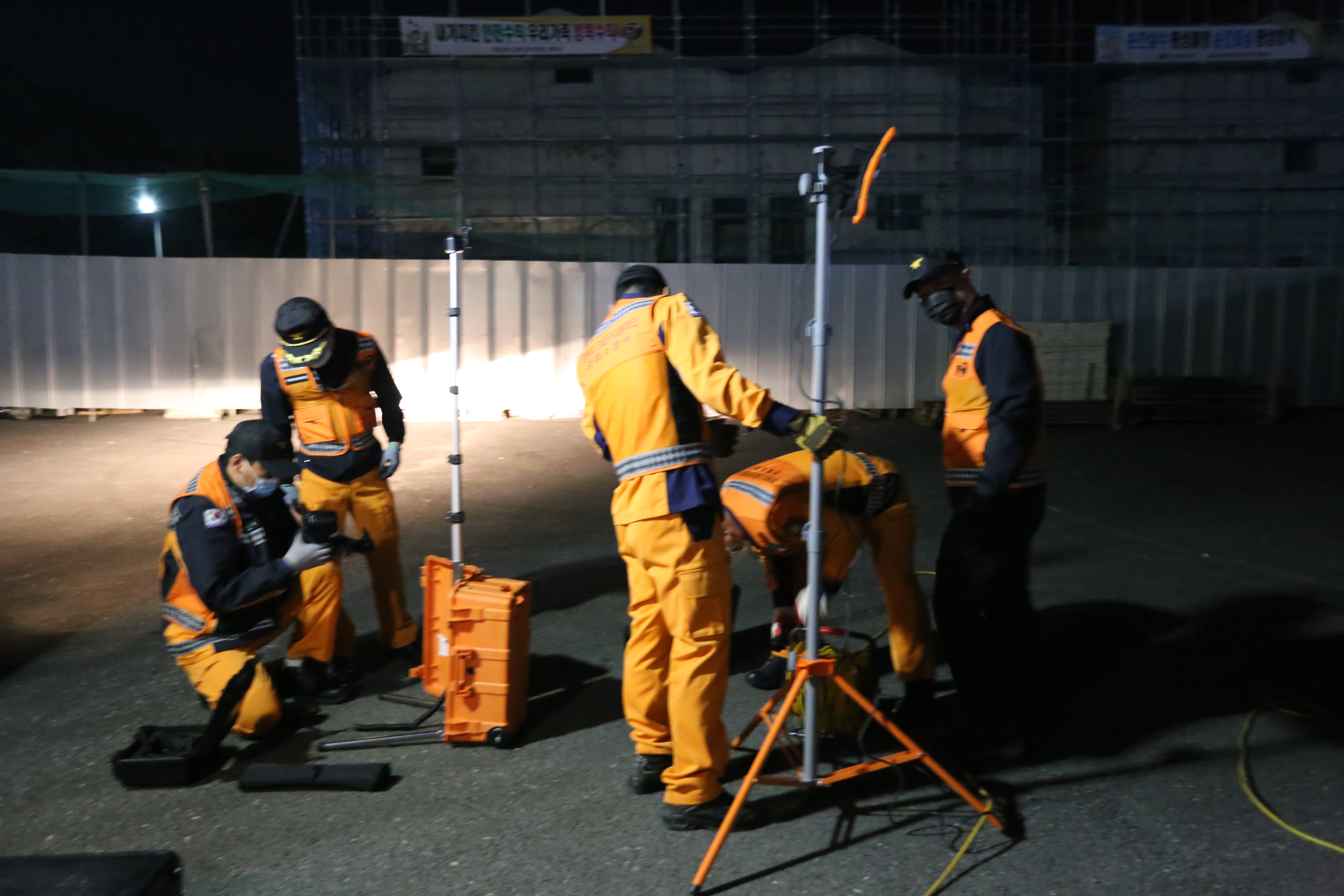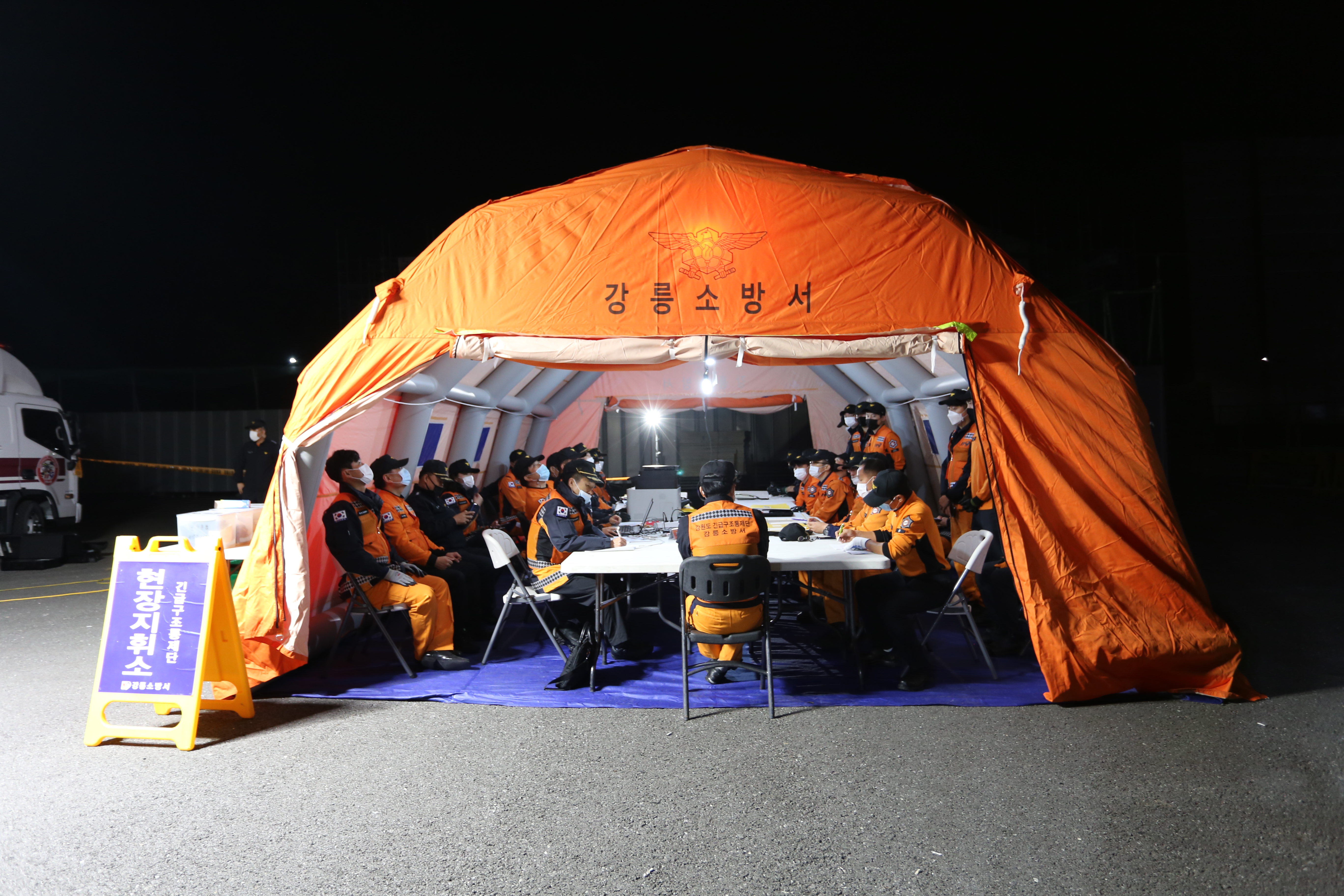 10얼 13일오후 7시부터 강릉소방서 앞 공터에서 긴급구조통제단 야간 불시출동 훈련을 하였습니다.